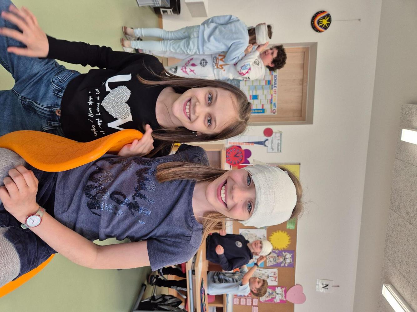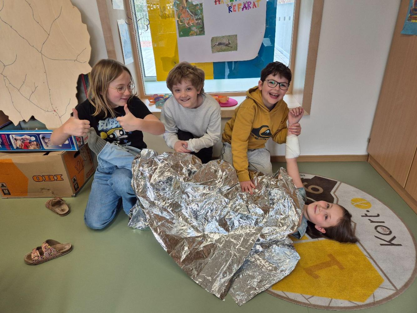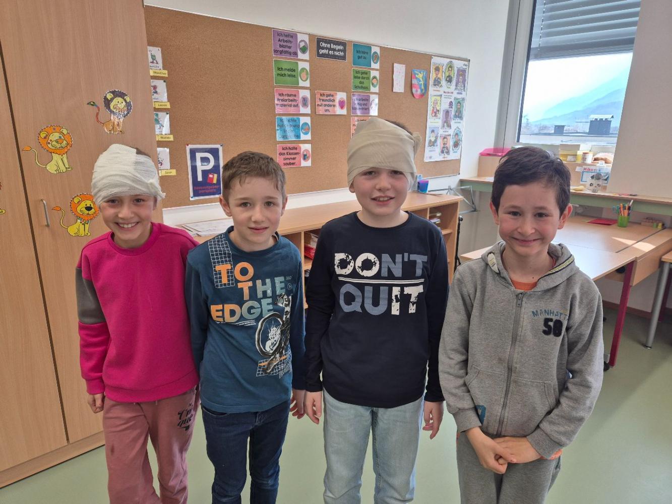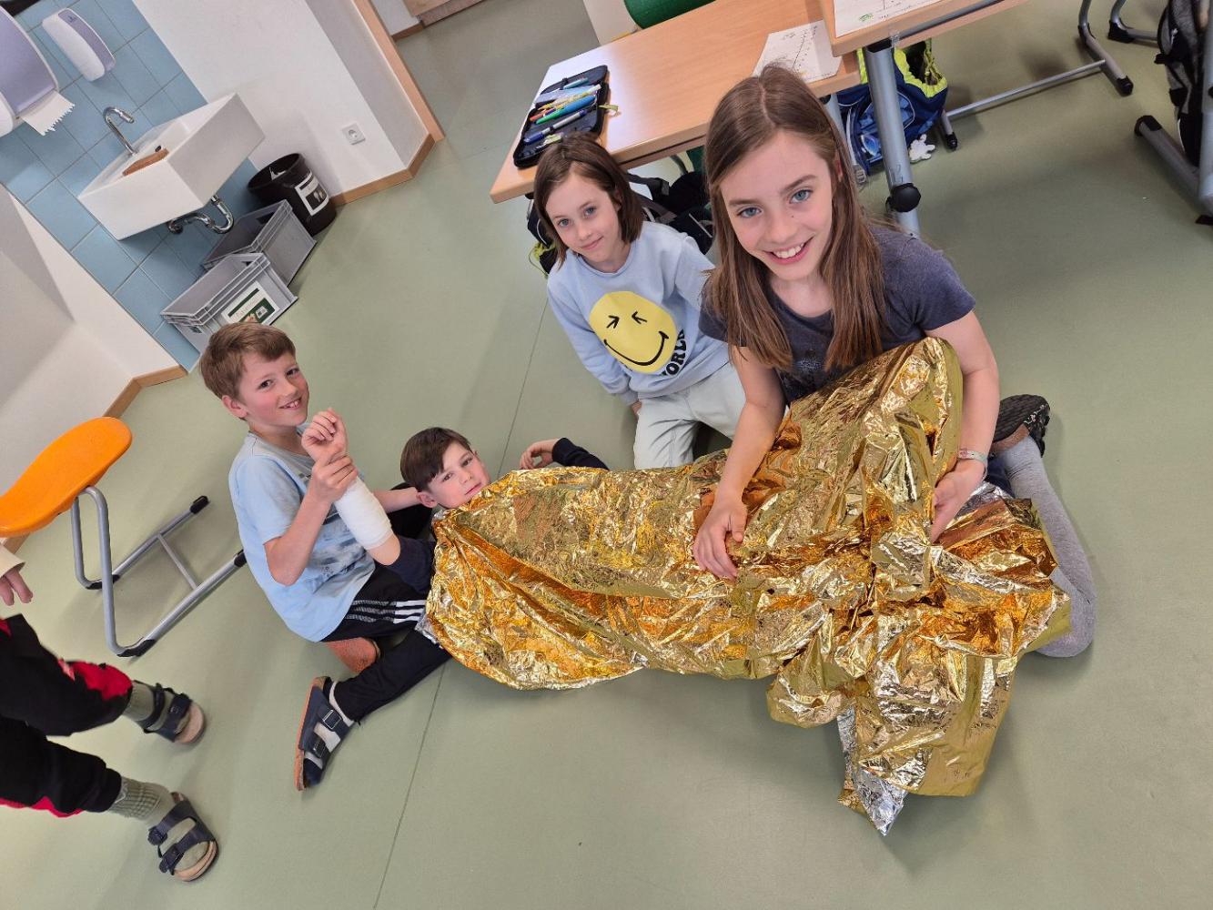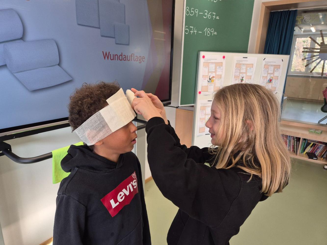 In den Erste-Hilfe-Stunden beschäftigten sich die Gruppen mit dem richtigen Absetzen eines Notrufes, den Basismaßnahmen und der Lagerung des Patienten. Sie können verschiedene Verbände anlegen und die Bewusstseinskontrolle durchführen.