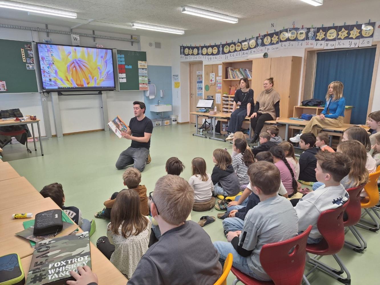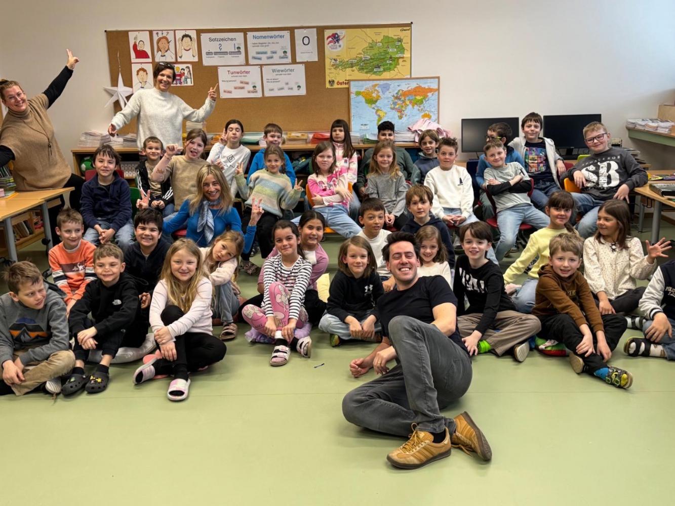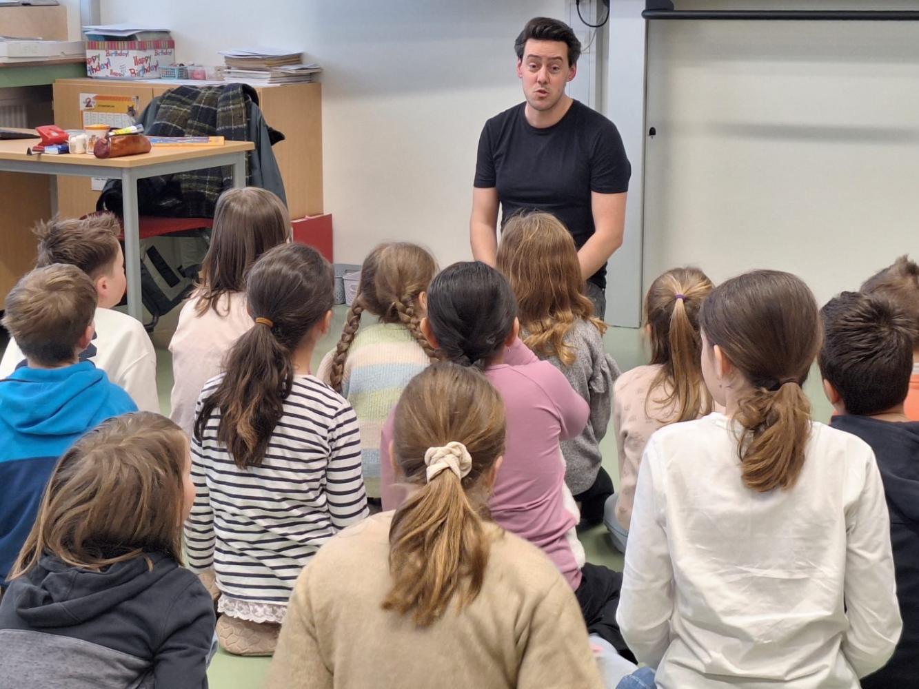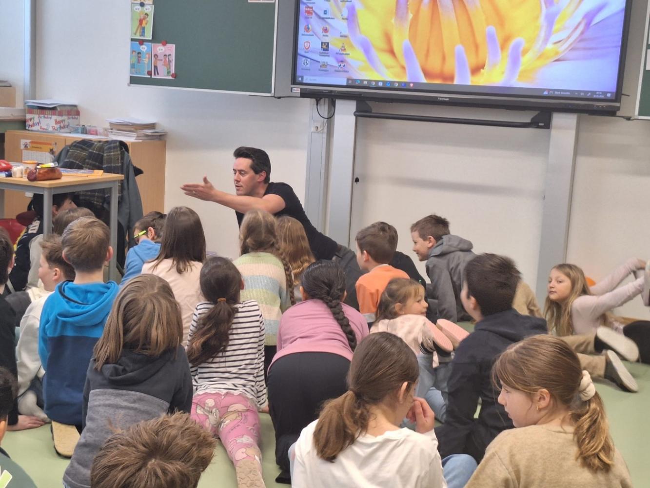 Auf Einladung von Frau Gander kehrte er an seine alte Volksschule zurück, um aus seinem Leben zu erzählen und den Kindern einen ehrlichen, spannenden Einblick in die Welt der Schauspielerei zu geben.
