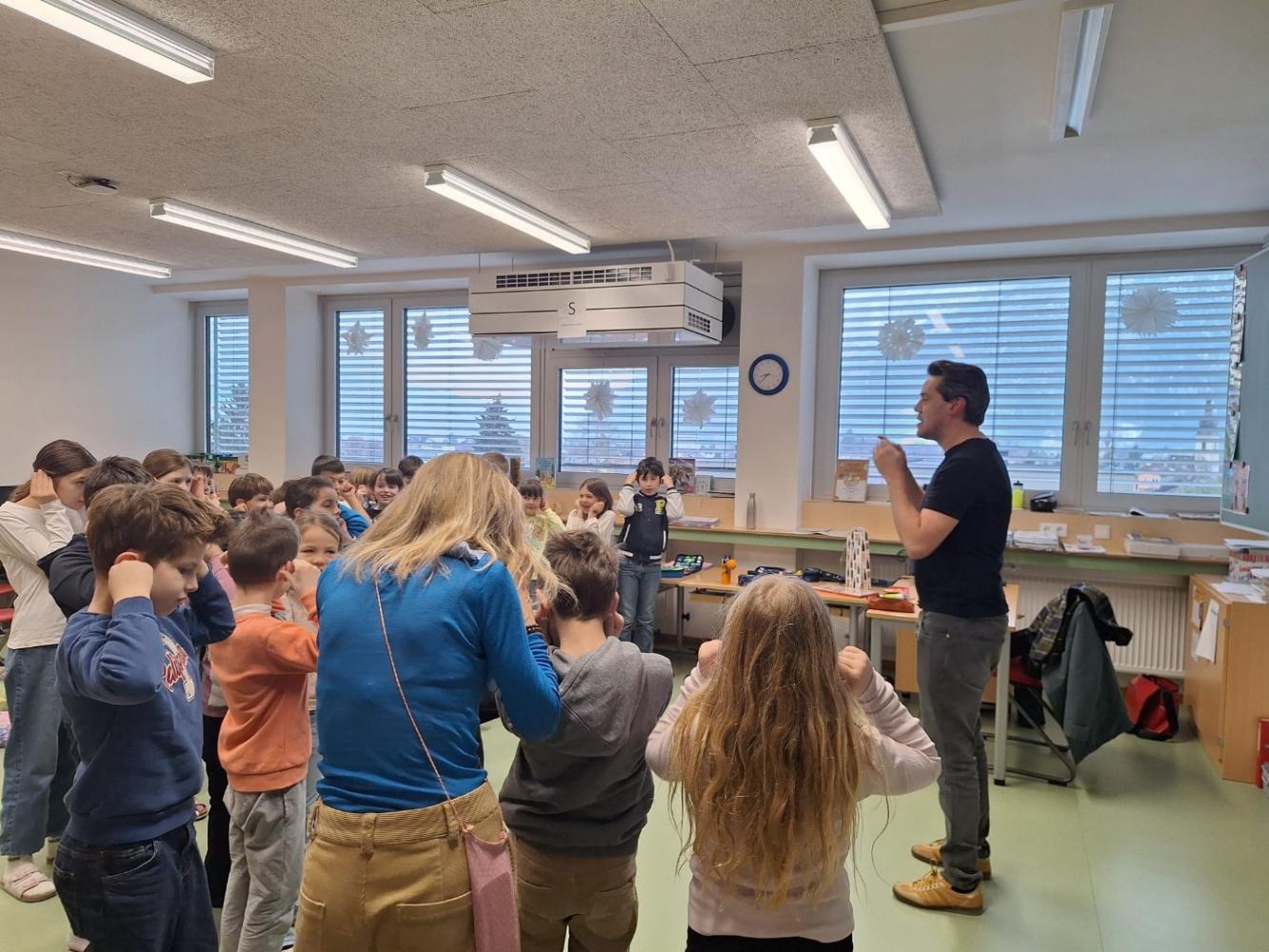 Dominik berichtete offen davon, wie sein Weg vom Volksschüler zum Schauspieler verlief, was ihn an diesem Beruf fasziniert und wie viel Übung und Durchhaltevermögen dahinterstecken. Besonders interessiert hörten die Kinder zu, als er von seinen Erfahrungen bei Film- und Theaterproduktionen erzählte und erklärte, wie man überhaupt Schauspieler wird.