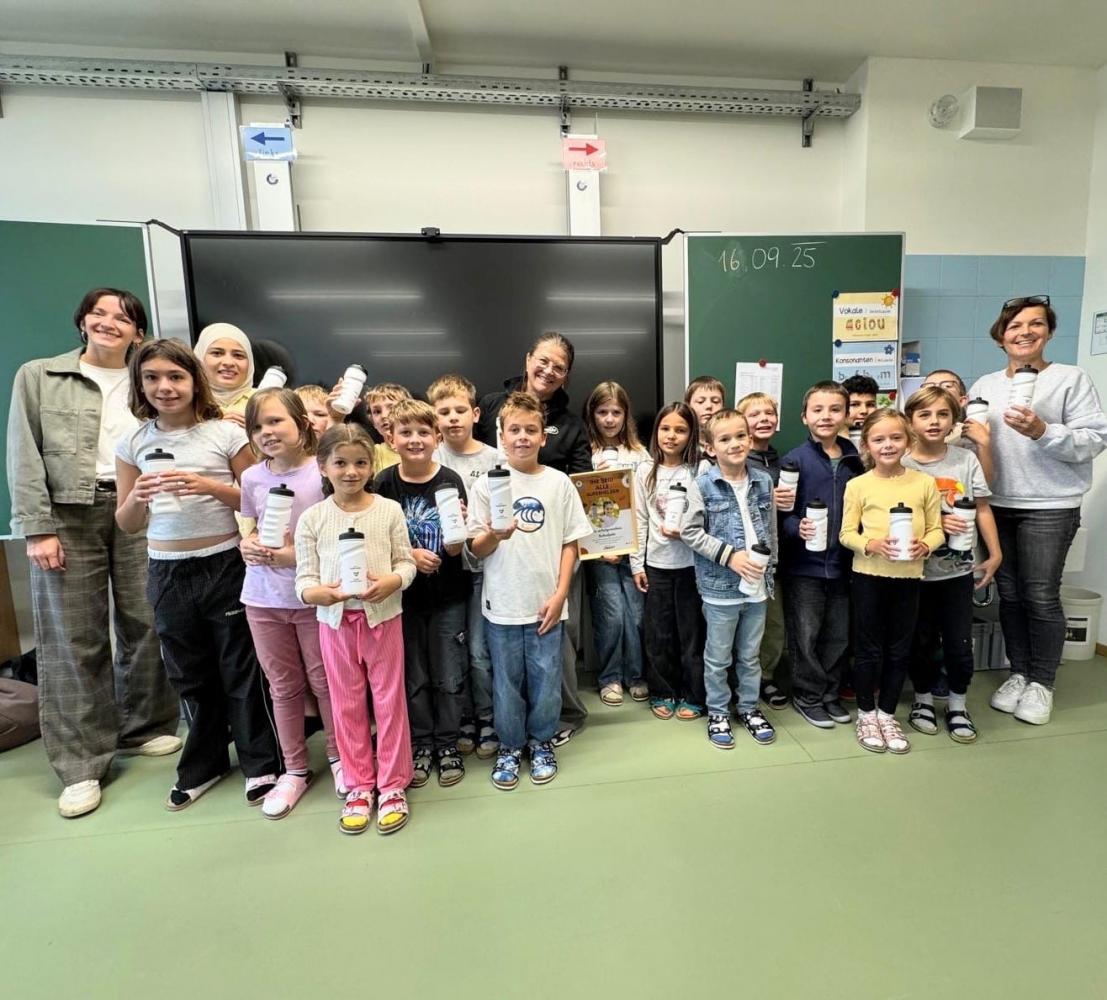 Superpower aus der Flasche von Carolina Oberschneider 22. September 2025 3a Gemeinsam mit ihrem Team besuchte Brigitte Joast daraufhin die Klasse 3a und überreichte jedem Kind sowie den Lehrpersonen eine coole Flasche. Eine tolle Idee – vielen herzlichen Dank an die Bäckerei Joast!