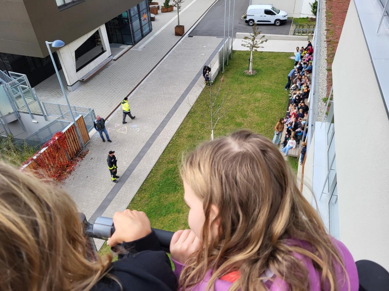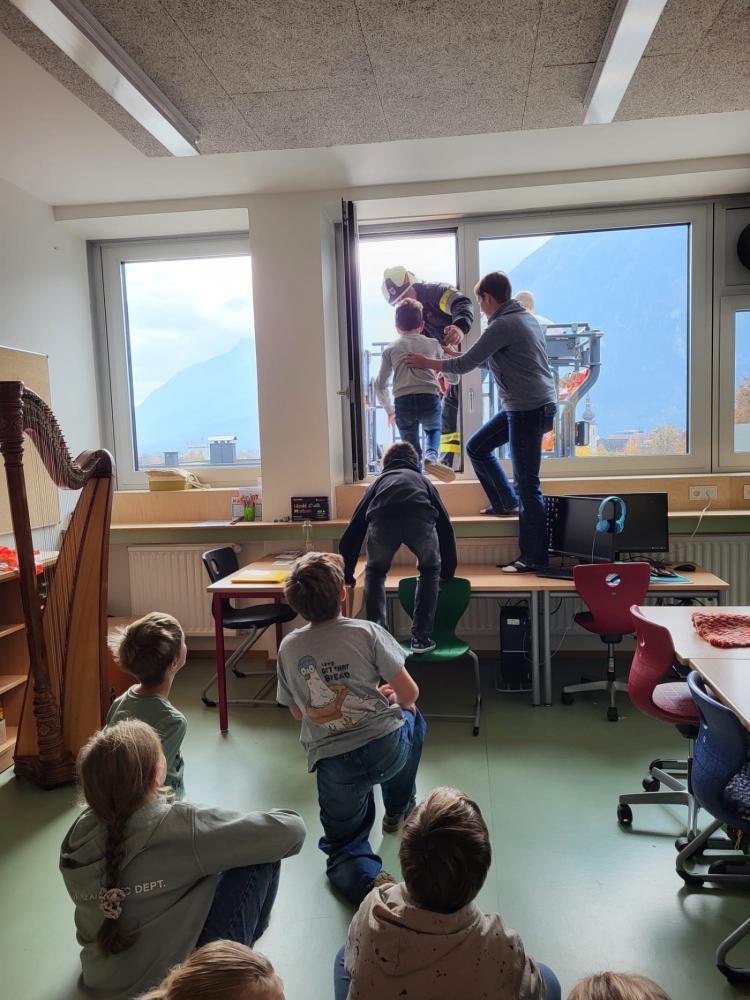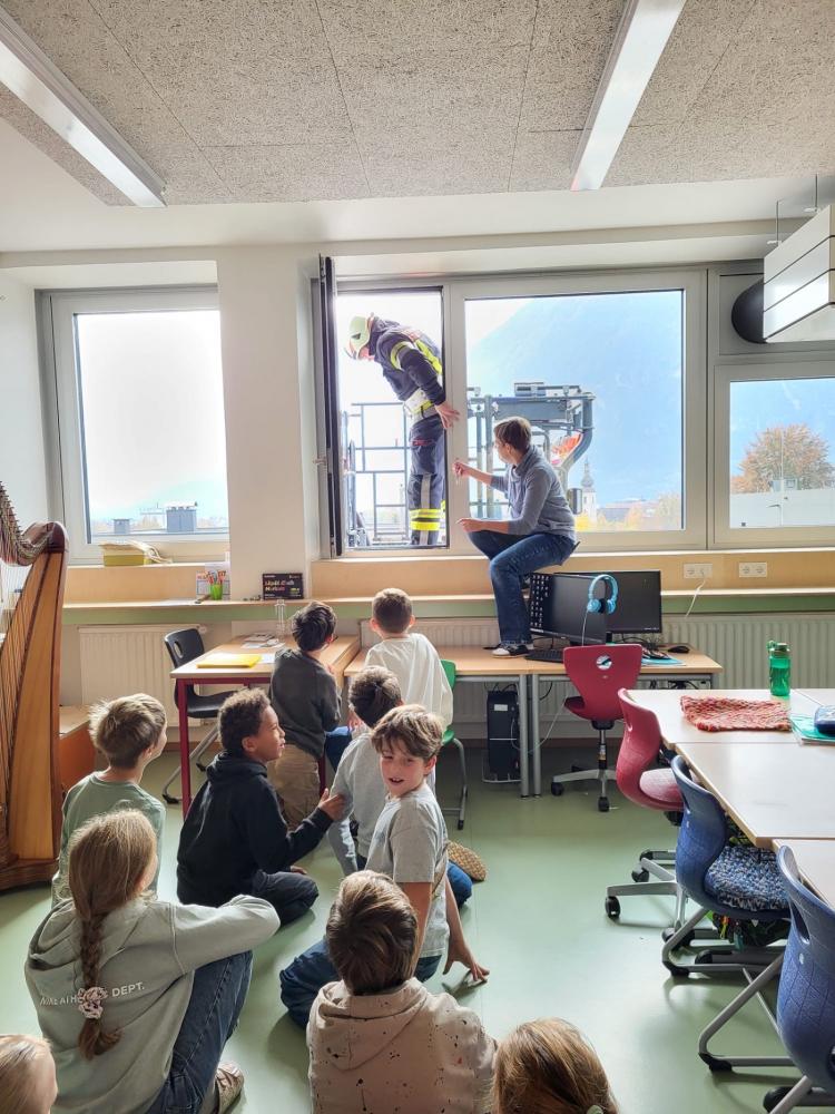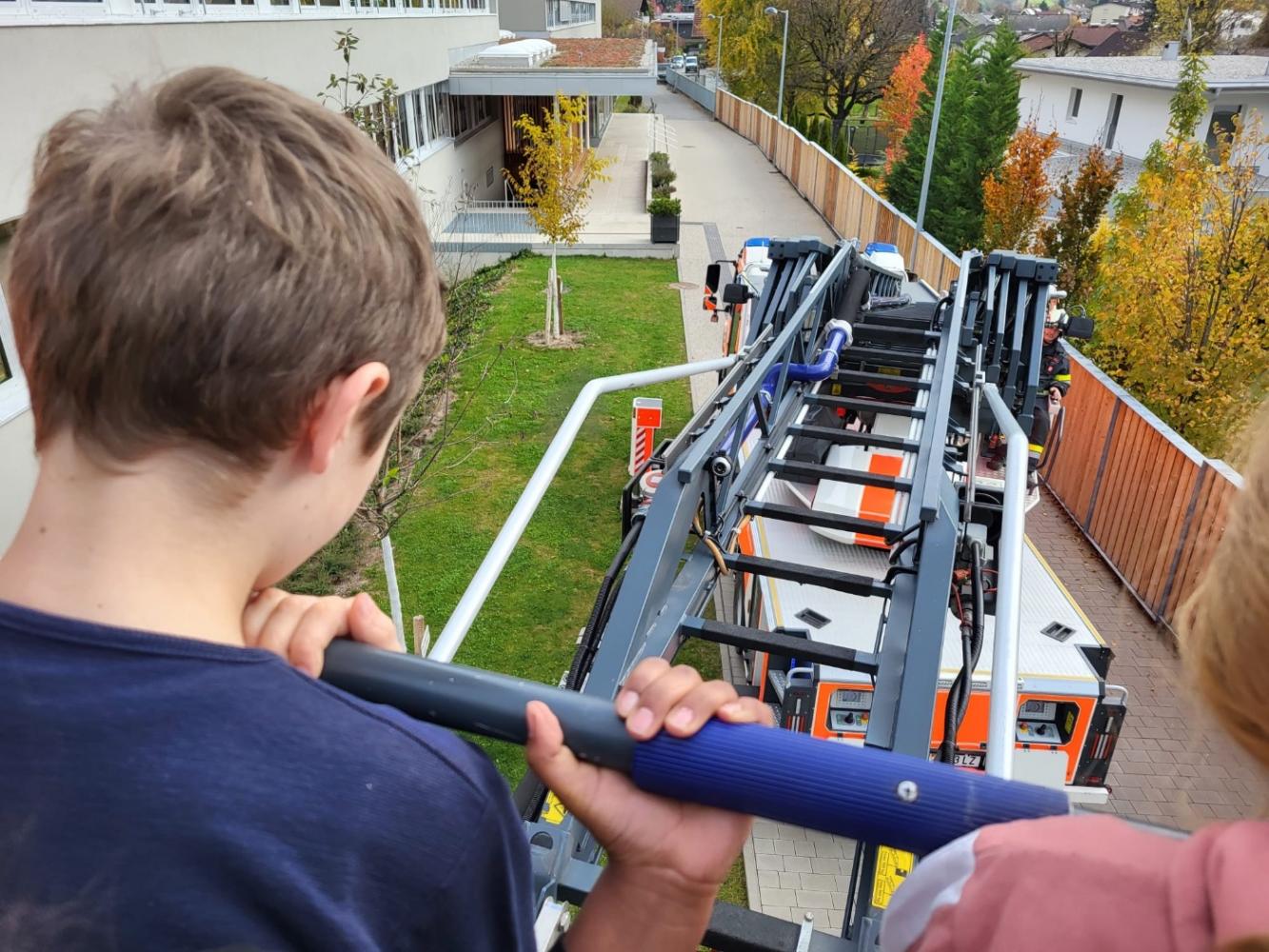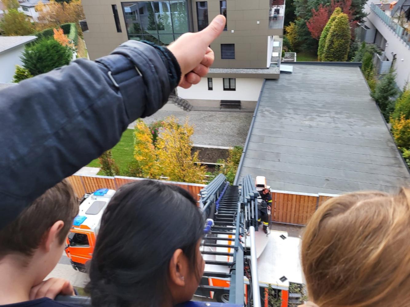 Am 21.10.2025 fand an unserer Schule eine spannende Feuerwehrübung statt. Besonders aufregend war die Rettung der Kinder der 4a Klasse aus dem 2. Stock – mit der großen Drehleiter der Feuerwehr wurden sie sicher nach unten gebracht.
